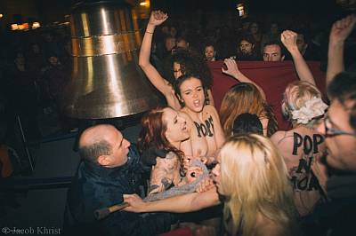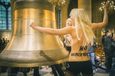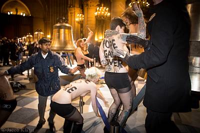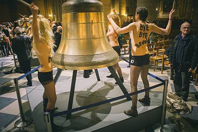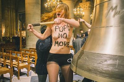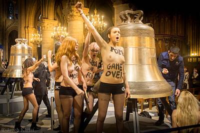 Već se dva dana ne smiruje medijska pompa zbog najave pape Benedikta XVI. o povlačenju s mjesta prvog katolika svijeta. Njegov odlazak u Parizu, točnije u, kako kažu, utvrdi katoličanstva, katedrali Notre Dame, obilježile i aktivistice iz pokreta Femen, gdje su, naravno u toplesu, odsvirale pogrebni marš za papu. U crkvi su se sukobile s osobljem, svećenicima i policijom, a u svojim porukama papu su nazivale homofobom, fašistom, a njegovu „organizaciju katoličkom mafijom. Fotografije akcije aktvistice su objavile na svome webu
