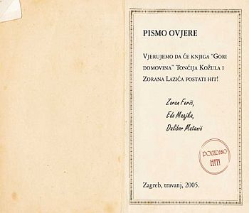 Po prvi put u povijesti hrvatske književnosti imate priliku svoje osobno ime, ime svojih prijatelja ili zaposlenika, ugraditi u jedan roman, i to ne bilo kakav! Radi se o hit-knjizi "Gori domovina: Steve i Samoula u Hrvatskoj" Zorana Lazića i Tonćija Kožula, o knjizi poduprtoj "Pismom ovjere" istaknutih i uspješnih umjetnika, te ugledom izdavačke kuće AGM, apsolutnog rekordera po broju osvojenih nagrada (14!) tijekom 2004. godine.