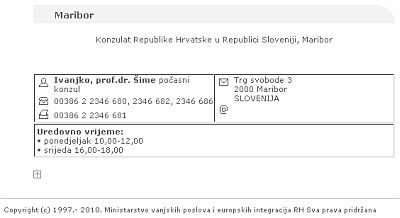 Ističete i kako autor našeg „zapisa zaboravlja ili ne poznaje, ili namjerno to prešućuje, da počasni konzulati, kao što je to Konzulat RH u Mariboru, nemaju nikakvih upravnih ovlaštenja, da vode bilo kakve postupke u vezi sa ostvarivanjem bilo kakvih prava. Za te postupke je ovlašteno konzularno odjeljenje Veleposlanstva RH u Ljubljani“. Nisu u pitanju nikakva upravna ovlaštenja, već nemogućnost da se dođe do bilo kakve informacije u konzulatu premda bi službene stranice Ministarstva vanjskih poslova naivnog hrvatskog građanina mogle navesti na pomisao kako se tamo nešto ipak može riješiti. Podsjećamo vas da je na stranicama vašeg „poslodavca“ jasno istaknuto uredovno vrijeme vašeg konzulata i nigdje ne piše da se radi o počasnom konzulatu, već se jasno daje do znanja da dolaskom u navedeno vrijeme možete porazgovarati s konzularnim predstavnicima svoje države. Zašto u istaknuto radno vrijeme nikoga nije bilo u konzulatu, nije nam poznato niti nakon vašeg reagiranja.