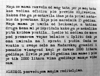 Naslijedio sam vinograd, ali nisam imao kada da pravim vino; dobijao sam ga od rođaka koji su se jedno vrijeme brinuli o očevom vinogradu. Od tih hiljadu litara, stotinu je bila graševina, a ostatak ono domaće koje se siječe kiselom vodom. Seljaci su voljeli očevo vino... Kada je otac umro, dogovorio sam se sa rođakom da pazi na vinograd. Htio sam da nastavim. Zbog oca. Rođak je krenuo da radi i da mi šalje graševinu, a za sebe je zadržavao ostatak, takav je bio dogovor. Nakon pola godine, pozvao me je i rekao da ne može dalje. Njegova žena je pokušala da se ubije, bacila se pod voz, pa... Eto. Otišao sam u selo da vidim tu ženu. Voz joj je otkinuo ruku... Kao bivši student filozofije – gotovo profesor – krenuo sam da razgovaram o smislu života sa ženom koja je nekoliko dana ranije pokušala da se baci pod voz. Čovječe...!