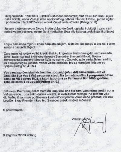 Pitate se kako napraviti poslovnu karijeru u Hrvatskoj? Pitate se kako se obogatiti? Lupež Vam u nastavku donosi pismo člana Uprave Hrvatske elektroprivrede Velimira Lovrića upućeno premijeru Ivi Sanaderu. Nakon što ga pročitate sve će Vam biti jasnije. Ne propustite ovo iznimno "uvlakačko" štivo bivšeg direktora Hercegovačke banke, danas menadžera najvećeg javnog poduzeća u Hrvatskoj, koje će Vam štošta otkriti i o Sanaderu samom.