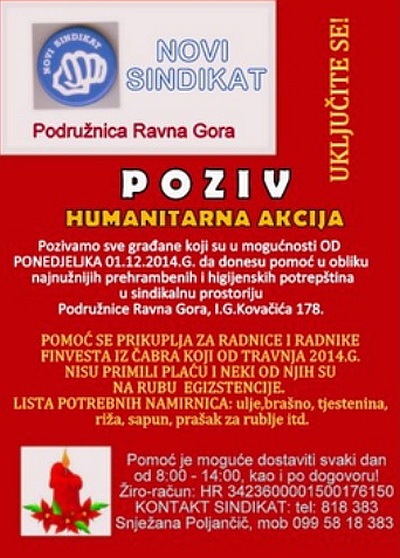Pomoć za radnike Finvesta u vidu najnužnijih prehrambenih i higijenskih potrepština prikuplja se u podružnici Novog sindikata u Ravnoj gori, u ulici Ivana Gorana Kovačića 178, u Zagrebu – ured Novog sindikata, Park stara Trešnjevka 2 te uplatama na žiro račun HR3423600001500176150.
