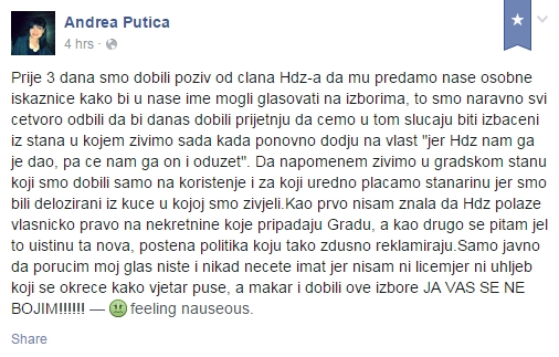 "Da napomenem, živimo u gradskom stanu koji smo dobili samo na korištenje i za koji uredno plaćamo stanarinu, jer smo bili deložirani iz kuće u kojoj smo živjeli. Kao prvo, nisam znala da HDZ polaže vlasničko pravo na nekretnine koje pripadaju Gradu, a kao drugo se pitam jel to uistinu ta nova, poštena politika koju tako zdušno reklamiraju. Samo javno da poručim: moj glas niste i nikad nećete imat', jer nisam ni licemjer ni uhljeb koji se okreće kako vjetar puše, a makar i dobili ove izbore JA VAS SE NE BOJIM!", napisala je Andrea Putica.