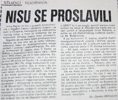 U pohodu na funkciju predsjednika HDZ-a jučer je donedavni ministar zdravstva, Darko Milinović, gostovao u televizijskoj emisiji Nedjeljom u 2. Što je sve tamo izgovorio, vjerojatno vam je već poznato, a mi ćemo se na ovom mjestu prisjetiti jednog manje poznatog detalja iz Milinovićeve biografije. Taj će vam detalj pokazati kako je čovjek koji pretendira na premijersku poziciju, uvijek bio na liniji. Naime, radi se o njegovom reagiranju, objavljenog u jednom dnevnom listu prije hrvatskog osamostaljenja, a u kojem kao gorljivi komunista brani Ivicu Račana