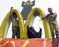 sku pušku uperenu u drugog "glumca", odnosno u bespomoćnu iračku ženu na koju pada bomba s natpisom USA. Sve to zanimljivije je jer se događalo na krovu jednog od korejskih McDonaldsa. Ti najpoznatiji fast food restorani u svijetu, bili su meta prosvjeda i u nekim drugim dijelovima planete. Studentski antiratni prosvjed nedaleko od američkog veleposlanstva u glavnom ekvadorskom gradu Quito-u, policija je morala zafajruntiti suzavcem, a na McDonaldsu je ostao visiti transparent s natpisom "You can get the best McCombos at McDonalds". U Buenos Airesu, argentinskoj prijestolnici prosvjednici protiv američkog napada na Irak, zapriječili su ulaz u McDonalds i to svojim tijelima koja su bila posuta crvenom farbom kako bi podsjećala na krv, a time i na žrtve koje je do sada odnio i koje će tek odnijeti ovaj nepotrebni rat. Najviše naselja McDonalds je osjetio u Barceloni, gdje su pacifistički raspoloženi studenti porazbijali izloge i nešto od samog inventara u jednom od restorana. Dakle, prošao je još jedan buran dan, a vidjet ćemo što nas čeka sutra!