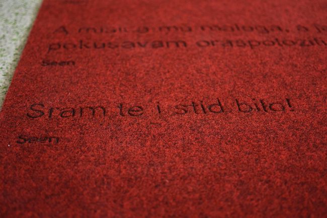 Radom je željela apostrofirati problem sveprisutnog nasilja u našem društvu tako što je prikazala nasilje njegovim direktnim postavljanjem pred publiku. Ironijski je iskorišten crveni tepih s ispisanim zlostavljačkim SMS porukama koje je dobivala od strane jedne muške osobe. Publiku je tako stavila u direktnu vezu s počiniteljem kao i sa žrtvom.