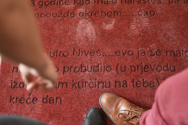 „Zapravo sam napravila jedan vrlo jednostavno čitljiv rad. Urezani tekst na crvenom tepihu djelovao je poput skorene rane. Svaka osoba koja doživi bilo kakvu vrstu nasilja nosi u sebi neku vrstu ožiljaka i rana. Nije dobro ako se ti unutarnji ožiljci ne njeguju pravilno i pravovremeno. Nakon izlaganja na nekoliko izložbi tekst se izlizao, rekla bih da su tako i rane zacijelile“, kaže Nives.