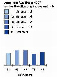 Zanimljvo je primjetiti i jednu promjenu. Naime, 1980. je broj stranaca bio mnogo veći od broja strankinja (2 619 000 : 1 834 000), dok se 21 godinu poslije, 2001. godine odnos između spolova poprilično uravnotežio (3 948 000 : 3 370 000). Najviše stranaca naselilo je gradske sredine, a njihov postotak najveći je u Hamburgu gdje čine 15,1% ukupnog stanovništva, a najmanji u Sachsen-Anhaltu 1,8%. Eto, ako se i vi zaputite trbuhom za kruhom, da znate kako stvari stoje.