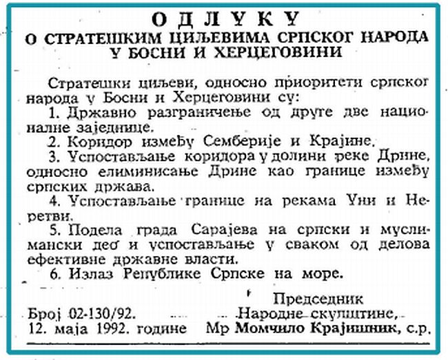 Ono što se u Srebrenici dogodilo u julu 1995. najavljeno je u dva dokumenta usvojena još 1992. a postupno realizovano u godinama koje su slijedile. Skupština Srpske Republike BiH na 14. sjednici održanoj 16. maja 1992. usvaja šest strateških ciljeva srpskog naroda. Strateški cilj broj 3 nalaže eliminisanje rijeke “Drine kao granice koja razdvaja srpske države” – Republiku Srbiju i Republiku Srpsku.