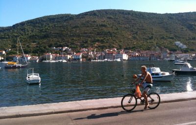 Ovo je Grad Vis. Tamo sve miriše i sve ide polako. I ovaj biciklist ide polako. I barke se polako ljuljuškaju kad im se dogodi malo mora. Na fotografiji nema mora. Bonaca je. Ulje je na vodi.