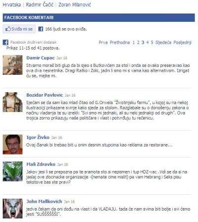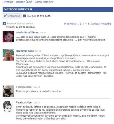 Dakako, radi se o komentarima čitatelja Jutarnjeg lista ostavljenim pod dio teksta o Milanovićevom i Čačićevom gostovanju u domu novinara Davora Butkovića, a o kojem smo na Lupigi već ponešto rekli. Između osam stranica komentara našli smo tri ili četiri komentara koji bi se mogli nazvati pomirljivim i sklonim šefovima oporbe. Sve ostalo - čista katastrofa. Uzgred, valja napomenuti da su PR stručnjaci SDP-a našli za shodno link na Milanovićevo gostovanje kod Butkovića staviti i na službenim stranicama stranke.
