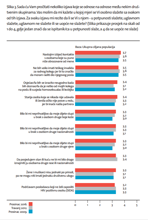 Istraživanje je pokazalo da se uvažavanje žena i drugih nacionalnosti nešto povećalo, ali u odnosu na prošlo istraživanje, manje ljudi bi iznajmilo svoju nekretninu osobi druge rase ili nacionalnosti, više bi ih osjetilo nelagodu na poslu kada bi radili s osobom s duševnim smetnjama ili s osobom s visokim invaliditetom, više osoba bi podržalo poslodavce u odbijanju kandidata zaraženog HIV-om, a više ih smatra i da su beskućnici sami krivi za svoje stanje, jer ne žele raditi.