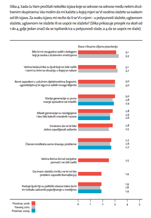 "No, unatoč socijalnoj distanci i predrasudama prema Romima, ispitanici/ce upravo njih vide kao najdiskriminiranije, samoinicijativno ih ističući mnogo češće nego pripadnike/ce ijedne druge društvene grupe. Točnije, svaki peti smatra kako su od svih skupina najdiskriminiraniji upravo Romi, nakon kojih slijede LGBT osobe (11%), osobe s invaliditetom (8.4%) te siromašne osobe (8.2%). Također, iako određeni broj ispitanika/ca podržava predrasudne stavove, veliki broj nema negativno mišljenje o pojedinim skupinama i ne slaže se s diskriminatornim tvrdnjama. Generalno gledajući, s većinom negativnih, predrasudnih ili pejorativnih tvrdnji ne slaže se oko tri četvrtine ili čak veći broj ispitanih. Dodatno, negativni stavovi i socijalna distanca znatno su manje prisutni nego prije pet ili osam godina, što znači da su građani/ke prihvatili postojanje razlika u našem društvu i ne smatraju ih zaprekama za međuljudske odnose", navodi se u istraživanju.