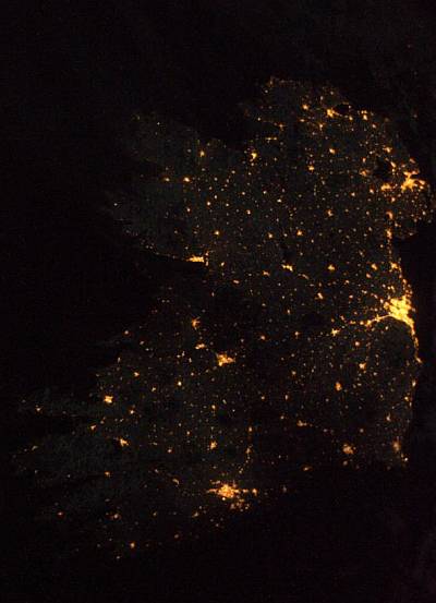 Irska, desno je Dublin, a druga najveća svjetla točka je Corck