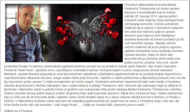 "Uprava dvorane, kako se bližio dan koncerta bila je izložena silnim pritiscima putem poziva, pisama, sms-ova, raznih protivnika Hrvata i hrvatstva, predvođenih jugokomunistima od kojih su se posebno isticali Jerko Bakotin, Ilija Grašić (navodno Hrvati) te Sead Husić. Zgroženi smo i začuđujuće iznenađeni lažima i mržnjom kojom su kroz svoja pisma iznosili navedeni. Nažalost, uprava dvorane popustila je pred bjesomučnim napadima i prijetnjama jugokomunista te se ponijela krajnje neposlovno i neprofesionalno otkazavši dvoranu svega sedam dana prije koncerta", stoji na službenim stranicama Marka Perkovića Thompsona.