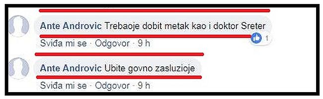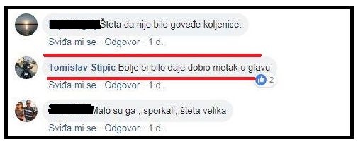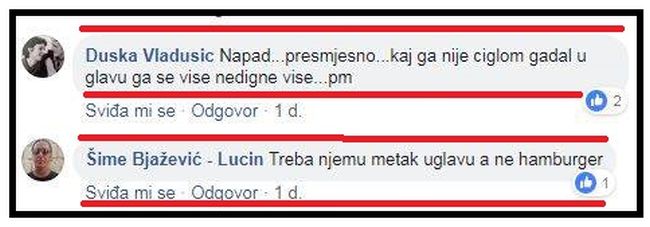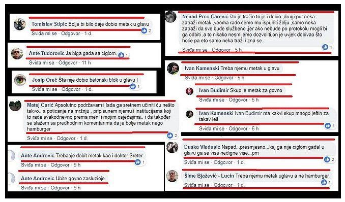 "Bilo bi bolje da je dobio metak u glavu! Ja bih gada s ciglom! Apsolutno podržavam i kada ga sretnem učinit ću nešto takvo, a slažem se s prethodnim komentarima da je bolje metak, nego hamburger! Ubijte govno, zaslužio je! Treba njemu metak u glavu! Treba njemu metak u glavu, a ne hamburger!"