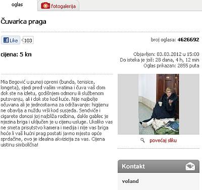Na Njuškalu već gotovo puna dva dana stoji oglas u kojem se njene usluge nude za tričavih pet kuna. „Mia Begović u punoj opremi (bunda, tenisice, longeta), sjedi pred vašim vratima i čuva vaš dom dok ste na izletu, godišnjem odmoru ili službenom putovanju, ali i dok ste kod kuće. Nije najbolje očuvana ali je jednostavna za održavanje: higijenu ne obavlja a nuždu vrši kod susjeda. Sendviče i cigarete donosi joj najbliža rodbina, dakle gablec je njezina briga i uključen je u cijenu usluge“, navodi nepoznati oglašivač koji se sakrio iza imena voland. U kontakt podacima je ostavio je tek broj mobitela, a do sada je imao tek jedan ponuđeni oglas. Tada je prodavao gitarsko pojačalo. „Ukoliko vas ne smeta prisutstvo kamera i medija i nije vas briga hoće li vaš kućni prag postati javno mjesto opće sprdačine, ovo je idealna akvizicija za vas. Cijena uistinu simbolična!“, zaključuje se u oglasu u rubrici starine.