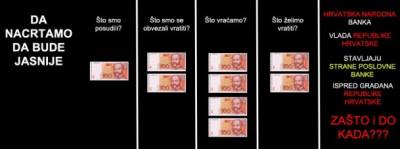 Tko je od ljudi koji su pred sedam godina na taj način kupili stan mogao pomisliti da upravo sebi i svojima potpisuje smrtnu presudu? Tko je mogao pomisliti da će zbog takvog kredita jednoj dvadesetosmogodišnjoj djevojci puknuti srce? Tko bi mogao pomisliti da će Država Hrvatska, Lijepa Naša, naša Domovina blagosloviti zločin stoljeća i ponijeti se prema svojim građanima gore nego Ameri prema Gadafiju? Nitko.