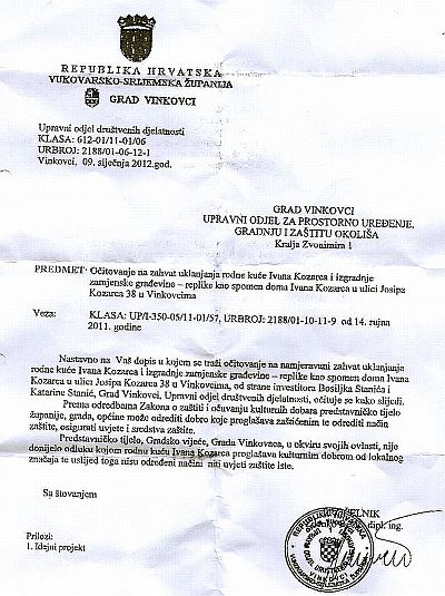 Investitor "zahvata uklanjanja rodne kuće Ivana Kozarca i izgradnje zamjenske građevine - replike kao spomen doma Ivana Kozarca" vinkovački je poduzetnik Bosiljko Stanić, vlasnik lanca trgovina Boso. Kako stvari stoje, njemu u zadatak palo je da napravi stariju i ljepšu rodnu kuću Ivana Kozarca. Ugledni poduzetnik Boso skrojit će Vinkovcima povijest po svojoj mjeri, a tu mjesta za rodnu kuću Ivana Kozarca naprosto nema.