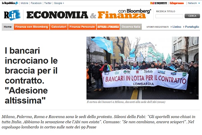 Unatoč tome što se očekivana dobit talijanskih banaka za ovu godinu kreće oko tri milijarde eura te što prognoze do 2017. godine najavljuju ogromne profite od ukupno dvadesetak milijardi eura, Udruga banaka Italije najavila je jednostrano ukidanje kolektivnog ugovora od prvog travnja ove godine. Sindikati i zaposlenici banaka reagirali su štrajkom u kojem je sudjelovalo oko 300.000 zaposlenih u bankama. Oko 7.000 prosvjednika bilo je u Milanu pred sjedištem Udruge banaka Italije dok su se povorke nezadovoljnih radnika, koji bi mogli ostati bez brojnih povlastica iz kolektivnog ugovora, prošetale i Rimom, Palermom te Ravennom.