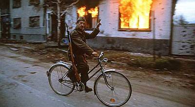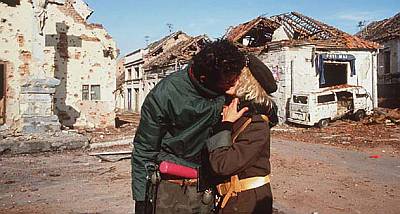 Golem broj vojnika i rezervista muva se kao bez cilja. Neki čovjek ugurava ženu u “stojadina”, ona neće. Previja se od plača i gleda mjesto gdje im je bio dom. Na kući preko puta zlokobno se vijori crna četnička zastava s natpisom “Sloboda ili smrt”. Tri kuće niže dva muškarca popravljaju krov. Što kada ga poprave? Cijeli kvart oko te kuće sravnjen je sa zemljom. Može li čovjek tu živjeti? Božo naglo skreće u pokrajnju ulicu, pokraj velike table “PAŽNJA! MINIRANO”. Gledam ga i vičem. “Koji ti je kurac, šta radiš?!!”, Božo se smije. “Očišćena je još prekjuče.