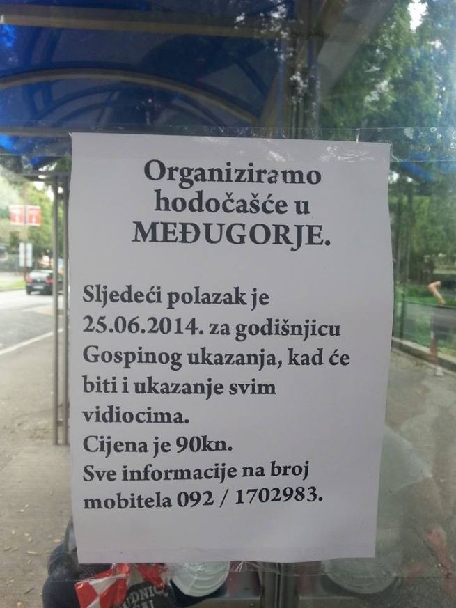 Hit dana na društvenim mrežama je definitivno oglas za organizirano hodočašće u Međugorje 25. lipnja 2014. godine na kojemu se predskazuje "ukazanje svim vidiocima". Cijena hodočašća je 90 kuna, a kako su nas zaista interesirali detalji puta, nazvali smo broj mobitela istaknut na plakatima koji su se pojavili na autobusnim stanicama u Splitu. Primjerice, pitali smo kada će se ukazanje dogoditi i hoće li hodočasnici dobiti povrat novca ukoliko se Marija, na primjer, zadrži u Lourdesu.
