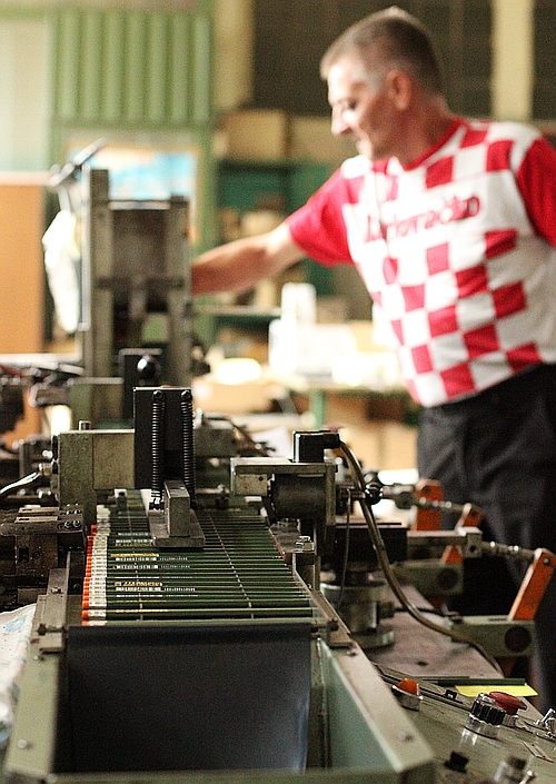 Zagi nas vodi od stroja do stroja i pokazuje kako koji funkcionira. Vidi se da svaki stroj poznaje u dušu. Stroj koji vidite zadužen je da na grafitne olovke stavlja gumice. I on je star, napominje Zagi, ali mogao je raditi još godinama. Svaki put kad se sjeti da pogon više neće trebati mehaničara, Zagi gunđa i psuje. Prema nama tad također promijeni raspoloženje pa se iz ljubaznog ubacuje u neljubazni mod. Ne zamjeramo mu niti najmanje. Cijelo vrijeme na pameti nam je ono pitanje: "A gdje ste, novinari, do sada bili?".