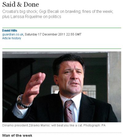 Dobacio je, rekosmo, Zdravko Mamić do Guardiana, zajedno s predsjednikom Hrvatskog nogometnog saveza Vlatkom Markovićem. Potonjeg su britanci izabrali za čovjeka tjedna, dok su - što se Mamića tiče - prepoznali njegov vanserijski talent za davanje kretenskih izjava.