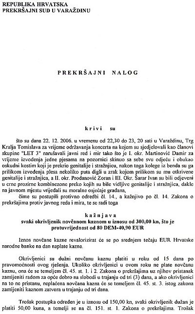 Prošle godine u prosincu je Let 3 zasvirao u Varaždinu, i to na otvorenom prostoru, na središnjem trgu, ispred zgrade gradskog poglavarstva. Unatoč negostoljubivoj hladnoći, bend je izveo već na stotine puta viđenu koreografiju, što se nikako nije svidjelo dvojici organa reda i mira. Naime, Damir Martinović Mrle sa sebe je skinuo svu odjeću i obukao "oskudni kostim koji je prekrio genitalije i stražnjicu", što, čini se, još nije bilo toliko problematično, koliko činjenica da su Mrleta potom njegove kolege podigle prilikom čega se kostim pomaknuo te se okupljenima ukazala Mrletova stražnjica, a bome i genitalije.