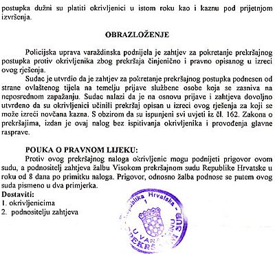 Sva trojica sankcionirana su novčanim kaznama od po 300 kuna, odnosno kako stoji u prekršajnom nalogu s po 80 njemačkih maraka (?!?!?!?) ili 40,90 eura te moraju platiti i sudske troškove u iznosu od ukupno 150 kuna. Okrivljeni su se žalili na ovakav razvoj situacije, a ako im žalba ne upali nadamo se da ispod madraca ili u kakvoj čarapi imaju još nešto sačuvanih njemačkih markica.